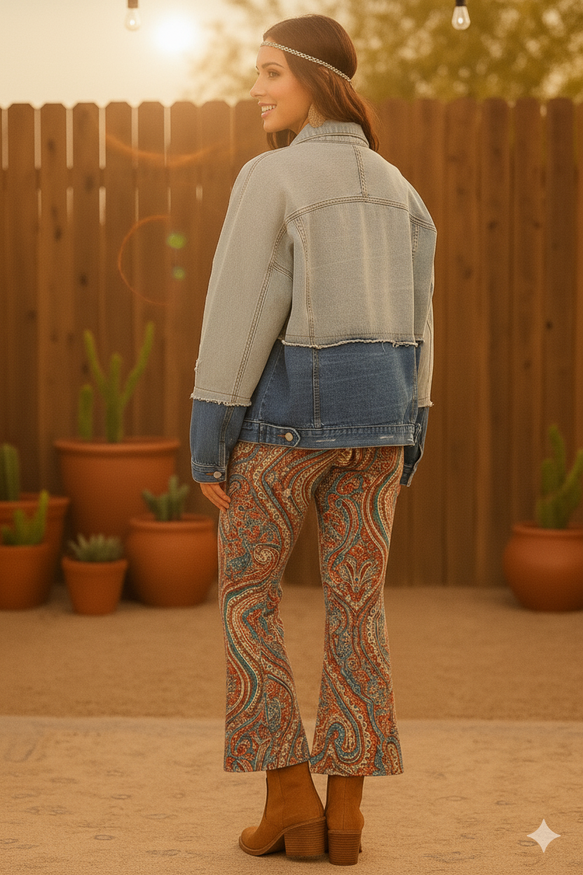 Add a little edge to your everyday šThis two-tone denim jacket mixes classic cool with a modern boho twist. Perfectly relaxed, transitional season piece, endlessly versatile, and made for layering through every season.