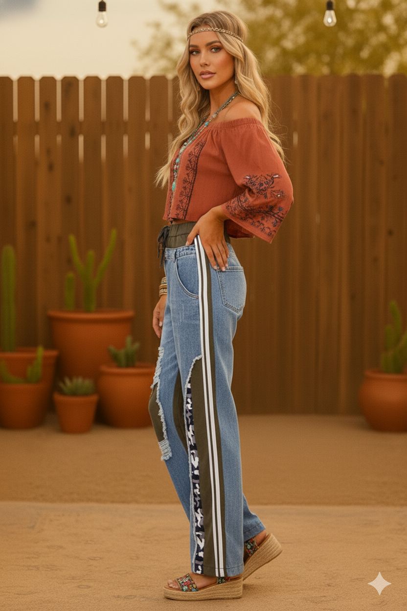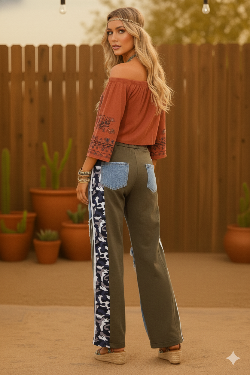 Meet your new statement pants 💋With a comfy elastic waist and bold camo print, these wide-leg jeans bring that street-chic-meets-boho vibe we’re living for. Pair with a crop top or sweater and you’re set.